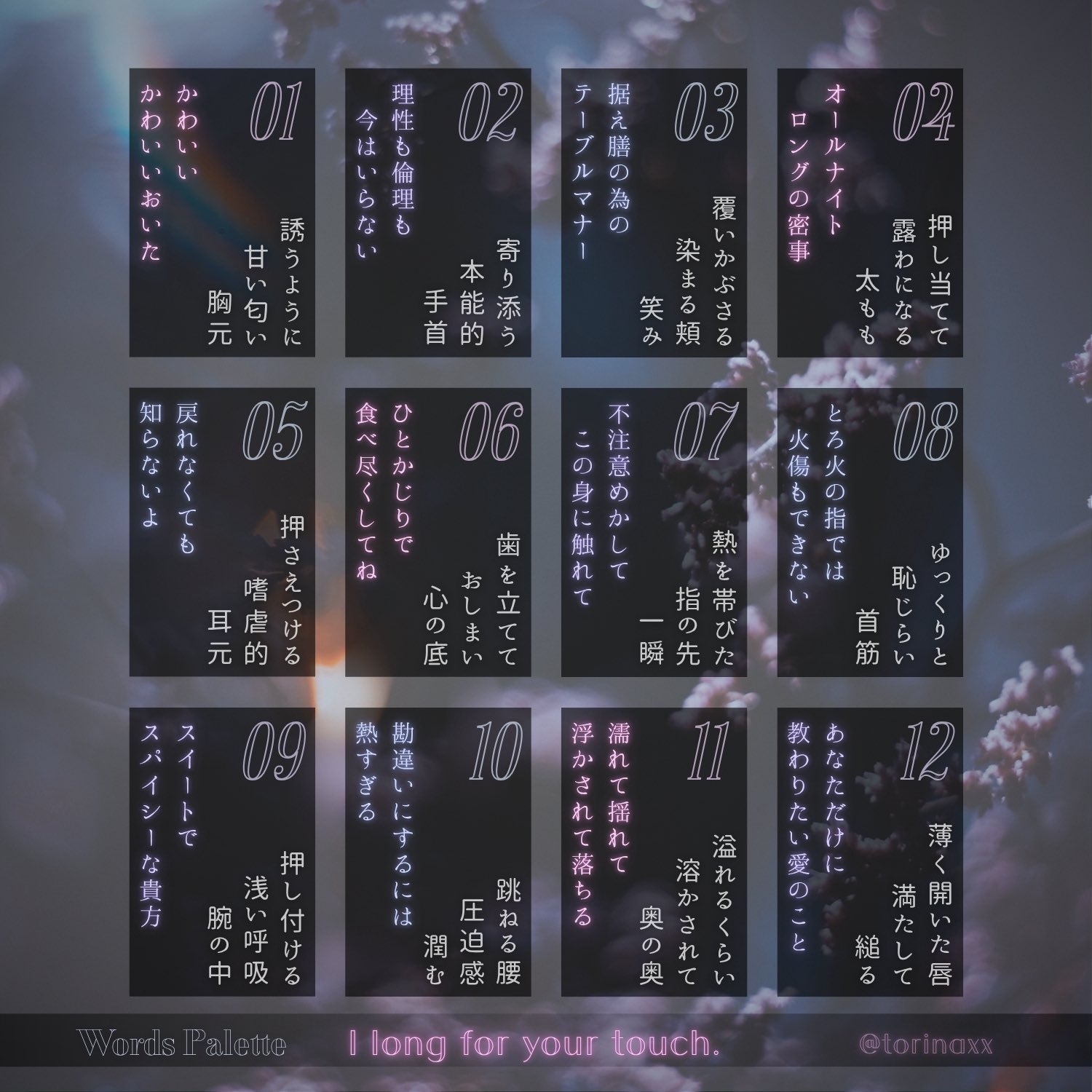 clapへ、ワードパレット内の【希望する番号】と【キャラクター】を送信してください。 シチュエーションなど希望があれば併せてご記入ください。 例:03ダイゴ、夢主は婚約者